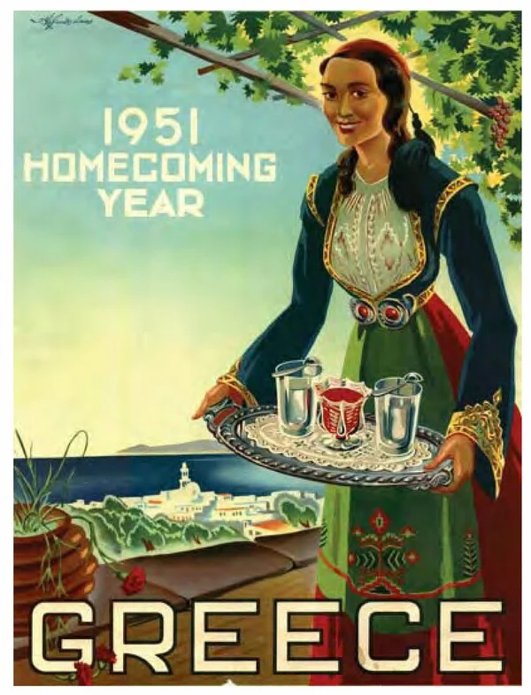 Το 1951, που αναφέρεται και ως «έτος απόδημου Ελληνισμού», επιχειρείται για πρώτη φορά η χρησιμοποίηση σλόγκαν. Πιο συγκεκριμένα, σε μια αφίσα με μια ζωγραφιά αρκετά φολκλόρ, αναγράφεται με ευκρίνεια και ευμεγέθη γραφικό χαρακτήρα η αγγλική φράση «1951 home coming year». Δημιουργός, ο ζωγράφος και χαράκτης Αλέξανδρος Αλεξανδράκης (1913-1968) γνωστός κυρίως από τους πίνακές του με θέμα τον Ελληνοϊταλικό πόλεμο του 1940. Το 1950 έλαβε το πρώτο και το δεύτερο βραβείο σε διαγωνισμό αφίσας για το Σχέδιο Μάρσαλ και την επόμενη χρονιά το Α΄ βραβείο αφίσας του ΕΟΤ.